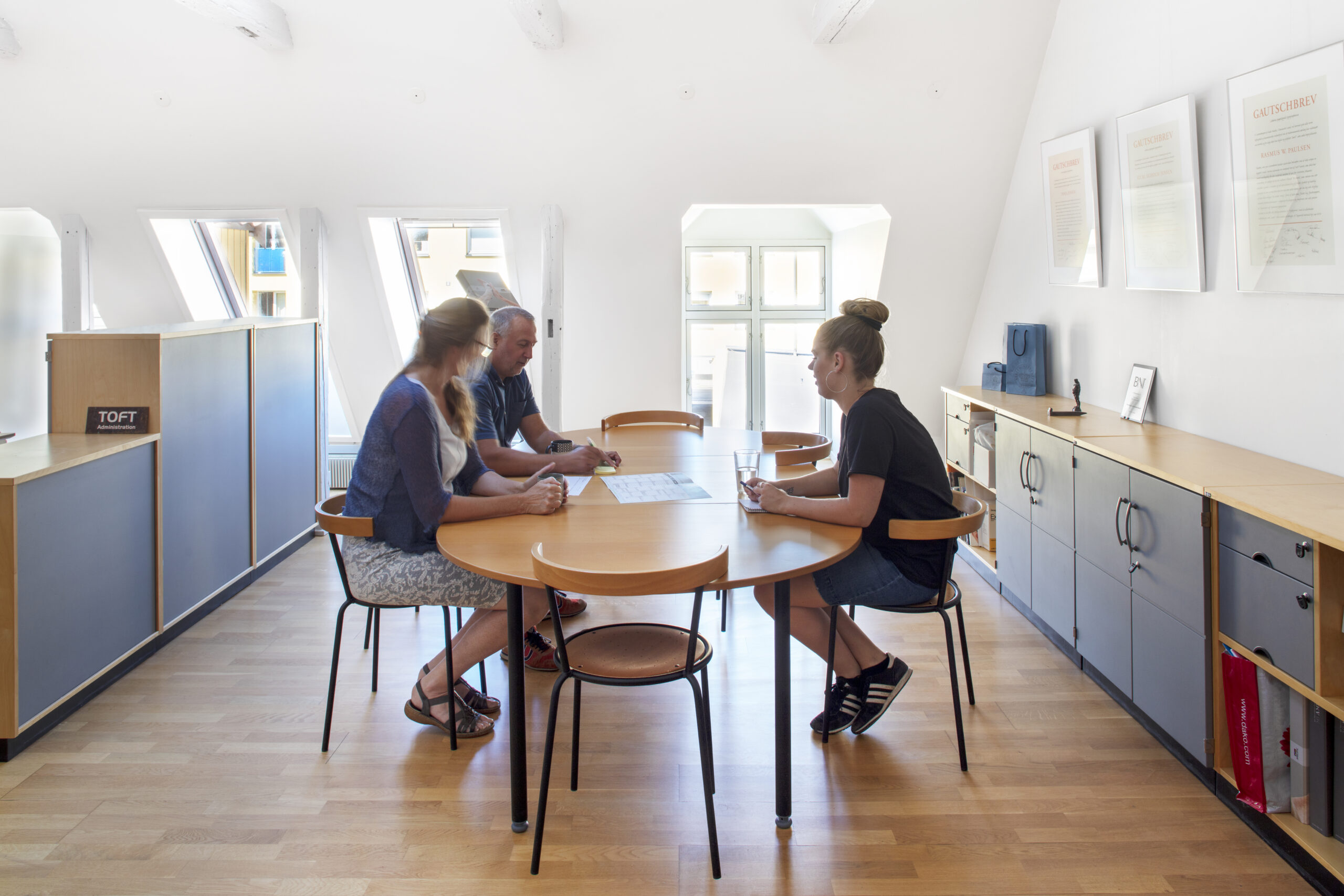 Generelt er vi alle på kontoret. Der er mulighed for at tage hjemmearbejdsdag, men det er ikke ofte vi tager det. Det kan være i forbindelse med at man får en VVS’er på besøg eller en opgave kræver at der er arbejdsro eller perioder, hvor det bare giver mening. Vi har rigtig meget dialog og samarbejde på tværs om vores arbejdsopgaver, som fungerer bedst når vi er samlet på kontoret.